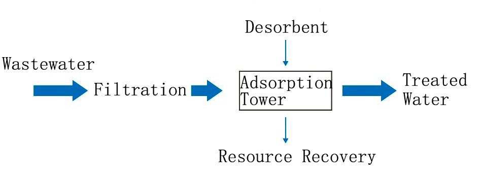El principio del proceso de adsorción de Haipu es utilizar los materiales de adsorción especiales desarrollados por nuestra empresa para adsorber selectivamente los componentes o sustancias que se eliminarán. Cuando la adsorción está saturada, se usa un agente de desorción específico para desorber el material de adsorción, lo que permite regenerarlo. Este proceso se repite continuamente. El proceso convencional de tratamiento de aguas residuales por método de adsorción se muestra en la siguiente figura.