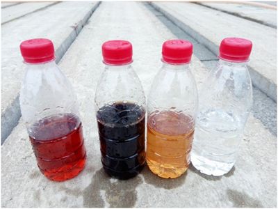 De izquierda a derecha: Líquido de desorción (materia orgánica recuperada), agua cruda, pretratamiento, Efluente de adsorción.