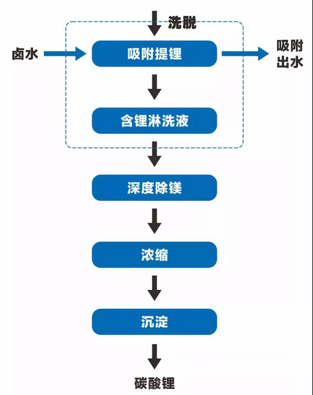 El proceso de producción de carbonato de litio con adsorción especial de litio DL760 como núcleo incluye cuatro pasos: extracción de litio, eliminación profunda de magnesio, concentración y precipitación.