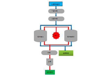 El proceso específico es el siguiente: el gas residual de dibromopropano en el taller se extrae primero por el ventilador de tiro inducido y luego se somete a condensación secundaria. La temperatura de la primera etapa de condensación es de alrededor de 25 ℃, y la temperatura de la segunda etapa de condensación es de alrededor de 10 ℃. El dibromopropano condensado y licuado se recibe en un tanque de almacenamiento, y el gas residual de dibromopropano no condensado se conecta a una torre de adsorción que contiene nanoadsorbentes para el enriquecimiento de adsorción (temperatura de adsorción a temperatura ambiente, presión de adsorción a ~ 2kpa). Después de la adsorción, el gas residual se puede descargar de acuerdo con las normas. Después de que el adsorbente se satura, se introduce vapor a baja presión en la torre de adsorción para pelar (a una temperatura de alrededor de 100 ℃). La mezcla de dibromopropano soplado y vapor de agua se puede separar y recuperar mediante licuefacción de condensación, sedimentación y capas. La temperatura del nanoadsorbente después de la desorción de vapor es relativamente alta. Después de enfriar a temperatura ambiente con aire limpio, se puede reutilizar para la adsorción. La torre de adsorción generalmente está configurada con 3 unidades, 2 para adsorción y 1 para desorción como respaldo. El efecto real de la aplicación de ingeniería es muy bueno.