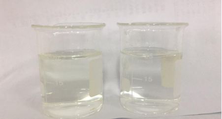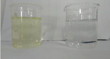 Nitrobenceno: Agua cruda (izquierda) ligeramente amarilla, efluente adsorbido (derecha) Imagen de apariencia incolora